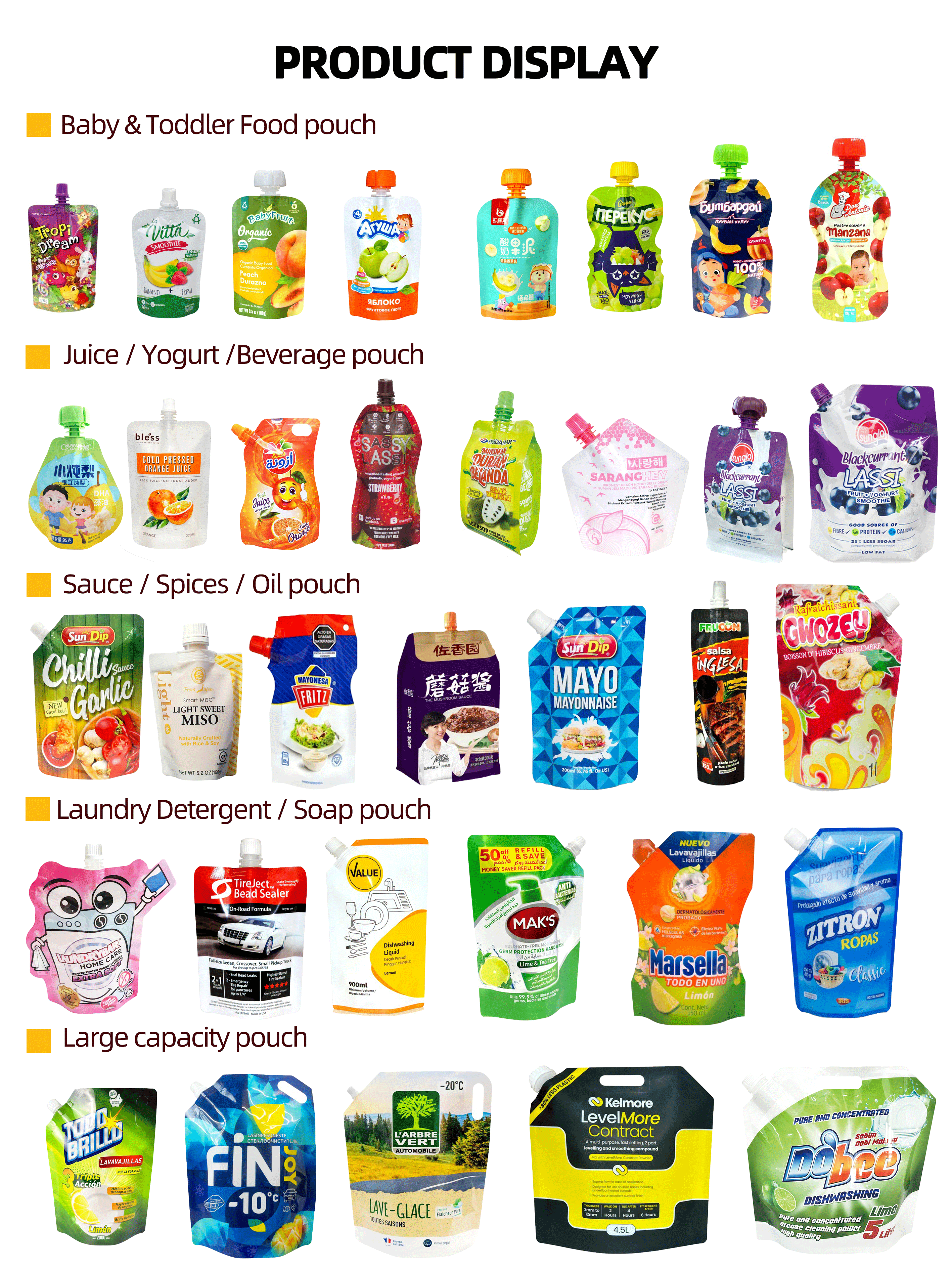 Today, spout pouches are widely used in all kinds of liquid products like juice, baby food, condiments,laundry detergent,cleaning products, etc.